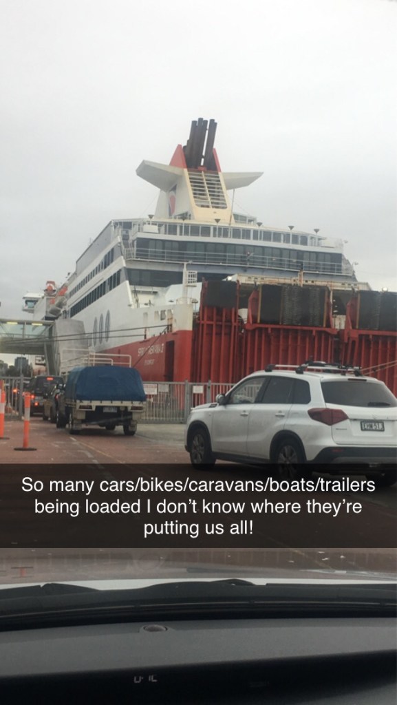 On the 10th of April with the car loaded to the hilt, we excitedly queued and were ready to board at Port Melbourne. It was astonishing to see how many trucks, caravans, campervans, cars and motorcycles were being loaded. It always amazes me how aeroplanes stay up in the sky with the weight they carry and now I was thinking how amazing it was for this ferry to float with all that cargo.