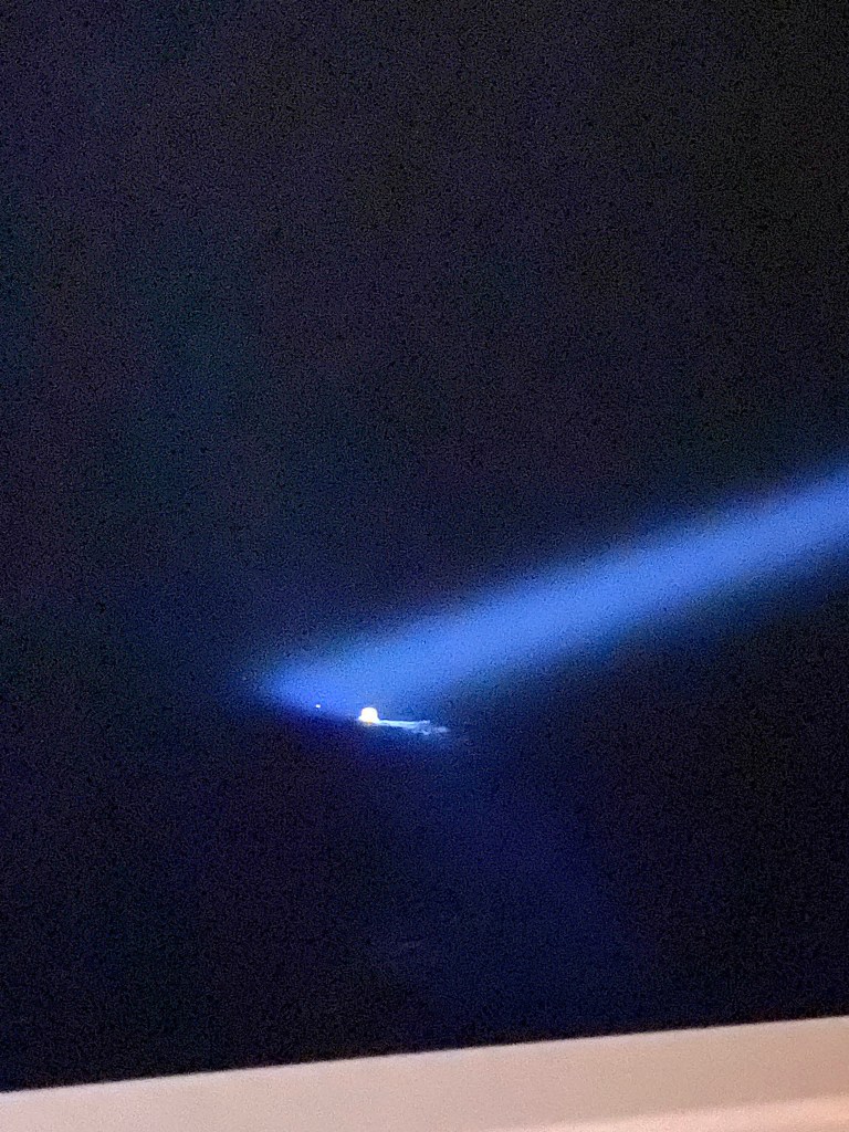 Having been up so early we were in bed at about 11pm. Ruthie was asleep when I heard the announcement “Oscar, Oscar, Oscar port side”. You hear announcements all the time and have learnt that Alpha means medical emergency. Suddenly I hear the engines shuddering and a knock on next doors cabin confirmed my suspicions that the ship had stopped! I turned on the TV to the ship map and sure enough it had turned around. I gently tried to wake Ruthie but she didn’t stir. I decided to get dressed and go upstairs. The crowd were milling and I soon heard the rumour that someone had gone overboard! A rescue boat had been launched and I also saw several life rings in the water that were illuminated and seemed to be remote controlled. Everyone was told to return to their cabins and all entertainment was ceased so they could account for numbers and report if anyone of their party was missing. My heart was racing as I rushed back to the cabin, this time to wake Ruthie. As she was rubbing her eyes, I gushed out the stories I had heard. That quickly woke her up! She was soon on the balcony, watching the searchlights and search vessels as were most of the passengers.