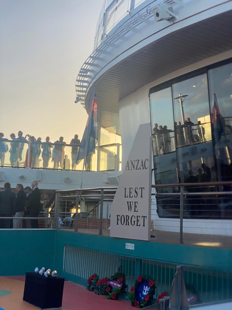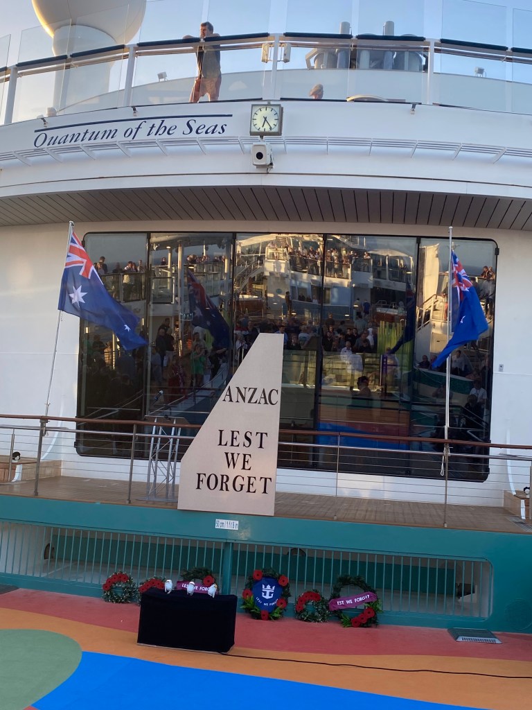 We also attended the dawn Anzac Day ceremony on the upper deck. It was currently very windy out on the ocean but the captain had manoeuvred the ship to give us shelter. It was a moving ceremony and the balmy conditions made it very different to the cooler dawn service we normally attend at home.