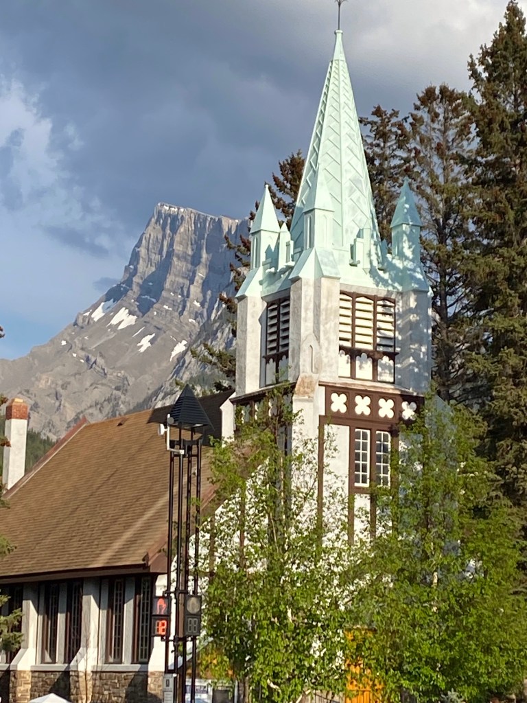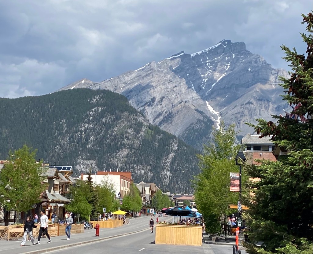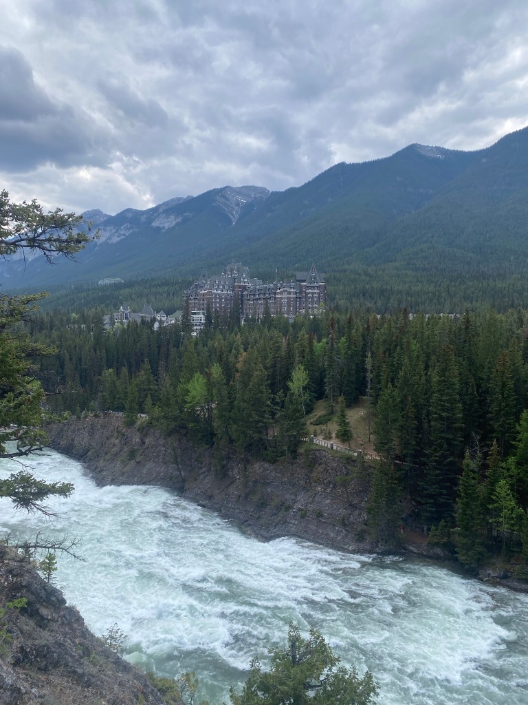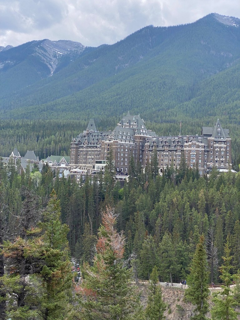 It wasn’t long before we saw the Rocky Mountain peaks. Most of the snow has melted and the shale and limestone mountains veered high into the sky. And then there was the town of Banff! Set in a valley surrounded by the Rockies, it instantly created a wow factor vibe. Before dropping us off at our hotel, the bus took us on an orientation of the town. We stopped at various locations but the highlights were the spectacular Banff Springs Hotel and the cascading Bow River falls.