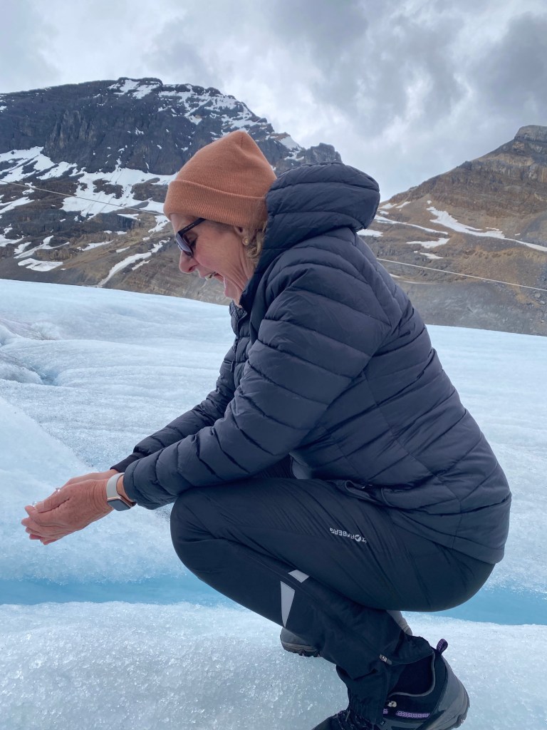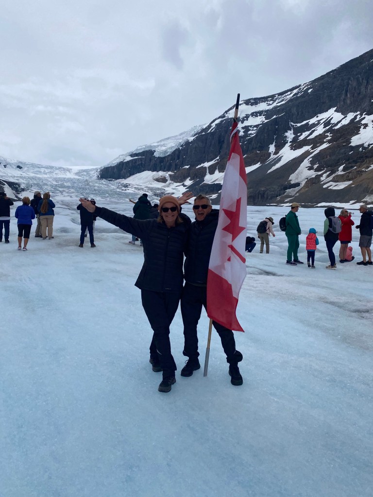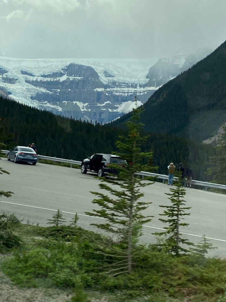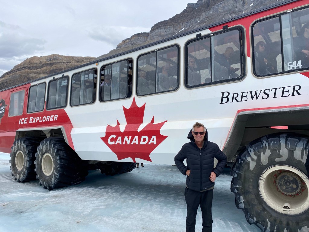 Next stop a ride on the 6 wheel drive Ice Explorer. We had to negotiate a 20 degree slope before we drove onto the ice-fields of the Athabasca Glacier where the ice is 200 metres thick. We alighted the vehicle and it was hard to believe, we were walking on a glacier that started forming over 200,000 years ago. It was ironic that we were being lectured that climate change was melting this glacier faster than ever, yet all these 20 tonne plus vehicles and graders were driving on it. All the while burning diesel and lubricant as well as wear and tear on the glacier. What was interesting was that the location is at the intercontinental divide which meant the melted ice water could either go to the Pacific, Atlantic or Arctic oceans. Upon leaving there were further stops at the Athabascan lake and waterfall, both stunning.
