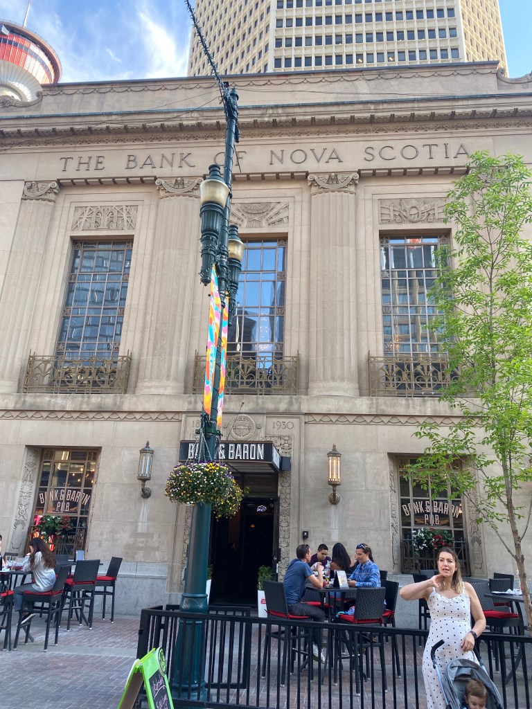 On leaving the cruise ship in Vancouver, we flew directly to Calgary, home of the Calgary Stampede each July. It’s quite a sizeable city with a population of 1.3 million. The city has had rapid growth due to its status as the centre of Canada’s oil industry. After checking in to our hotel we went exploring. We found the historic Stephen Avenue mall. It’s a historic landmark of buildings from the early 1900’s. The Nova Scotia Bank was our choice for happy hour. The building had been transformed into a bar and restaurant (as many of the old buildings have) and retained all the characteristics of the old building. We also found the Calgary tower but Ruthie was kind to me and didn’t ask to go up it!