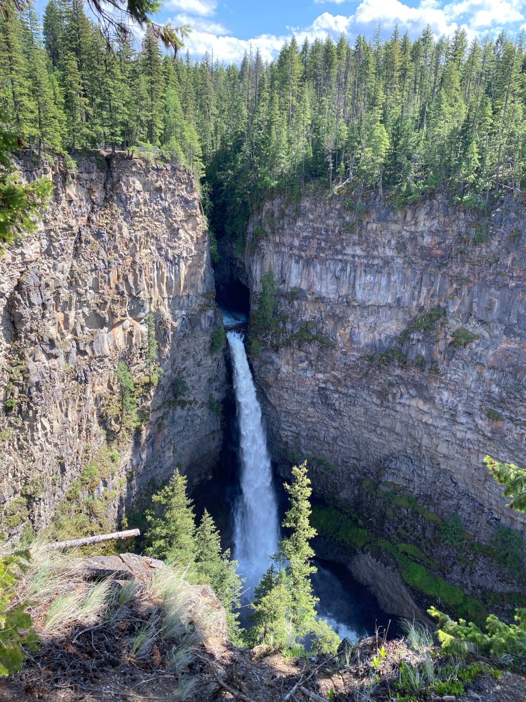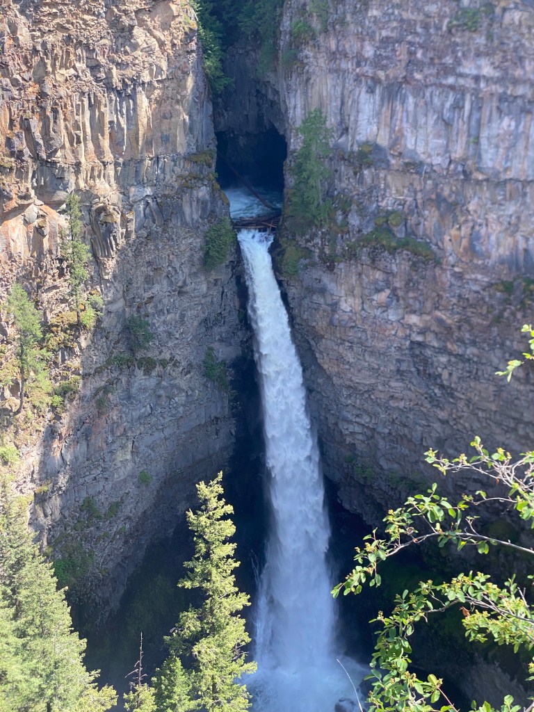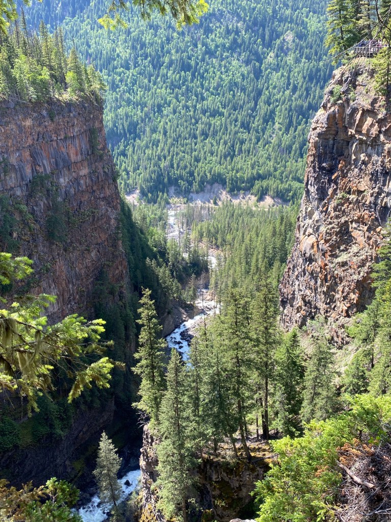 Yellowhead Highway continued to take us south along the mighty Thompson River and out of the Rocky Mountains. The scenery was changing and the trees were getting bigger and taller. Trees on the sub alpine only have a short growing window due to the climate which in turn stunts their growth. This also explains why it takes so long for the forest to regenerate after wildfires in sub alpine areas. It was nearly shorts and tee shirt weather as we were now descending from the cooler altitude.After a rest stop at Clearwater we took a short detour to Spahats Falls. The sound of the huge mass of water cascading and hitting the canyon floor sounded like thunderclaps. I don’t think our photos did justice to the scenery.