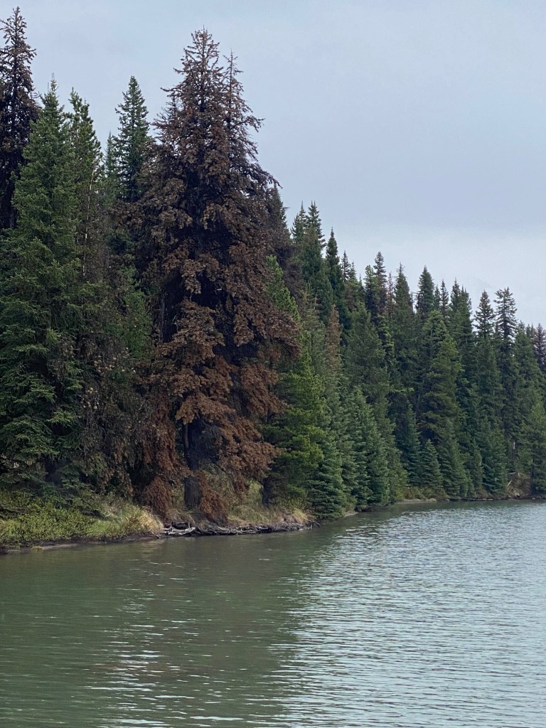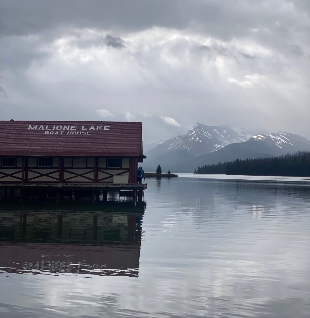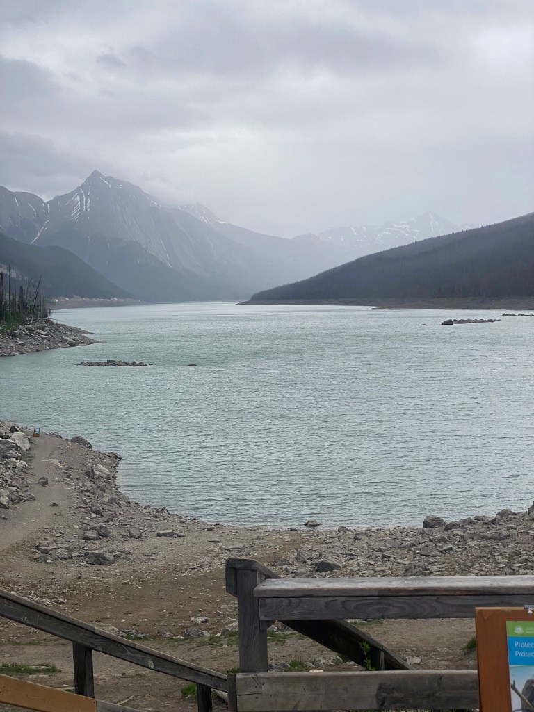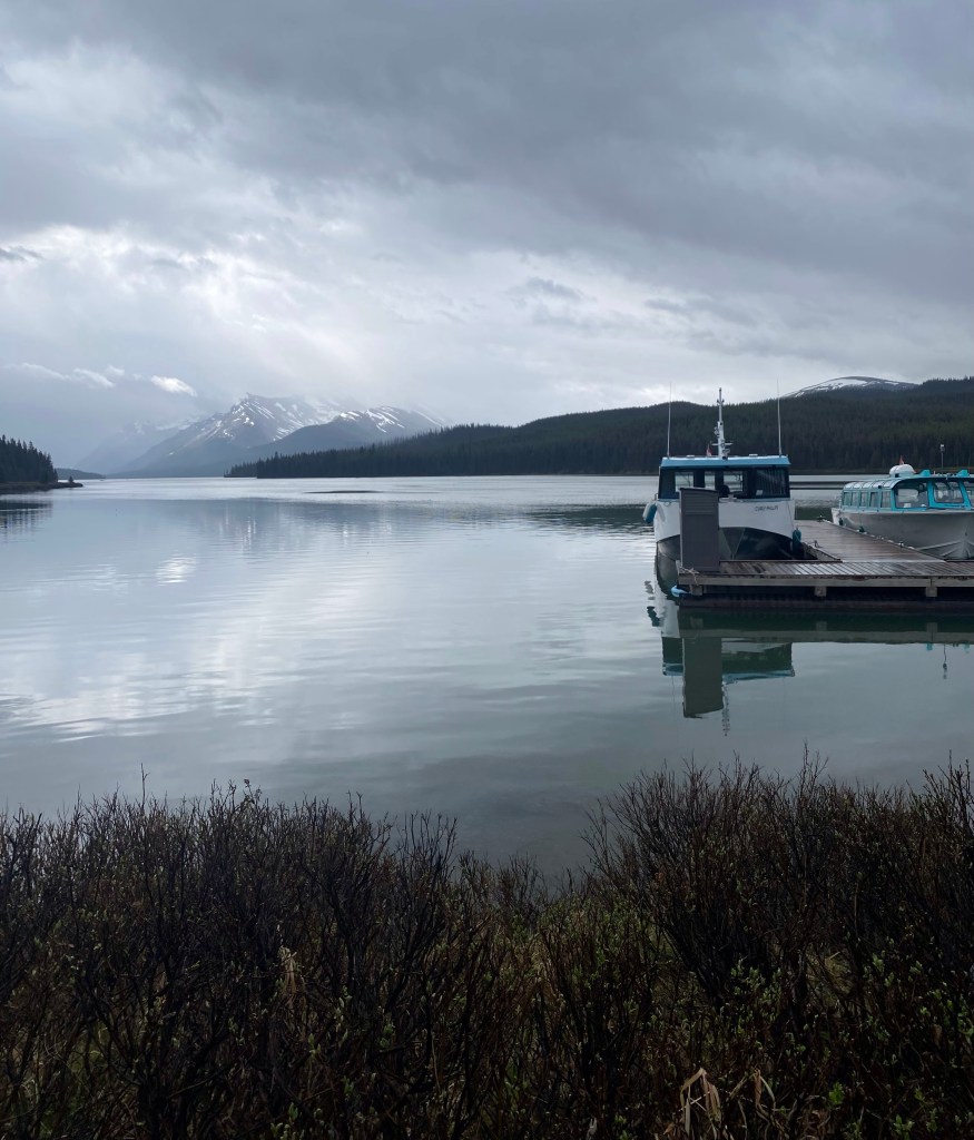 Out of Jasper the following day the bus took us on a guided tour of Maligne Lake which is 1800 metres above sea level in the Sub Alpine area. In a bleak winter the temperature here can get down to -30 or more degrees. The Jasper weather was forecast at 19 degrees so we were unprepared for the colder weather at the lake. Rookie mistake! Regardless of the weather, which made the lake look very mystical, the guided tour was very informative.