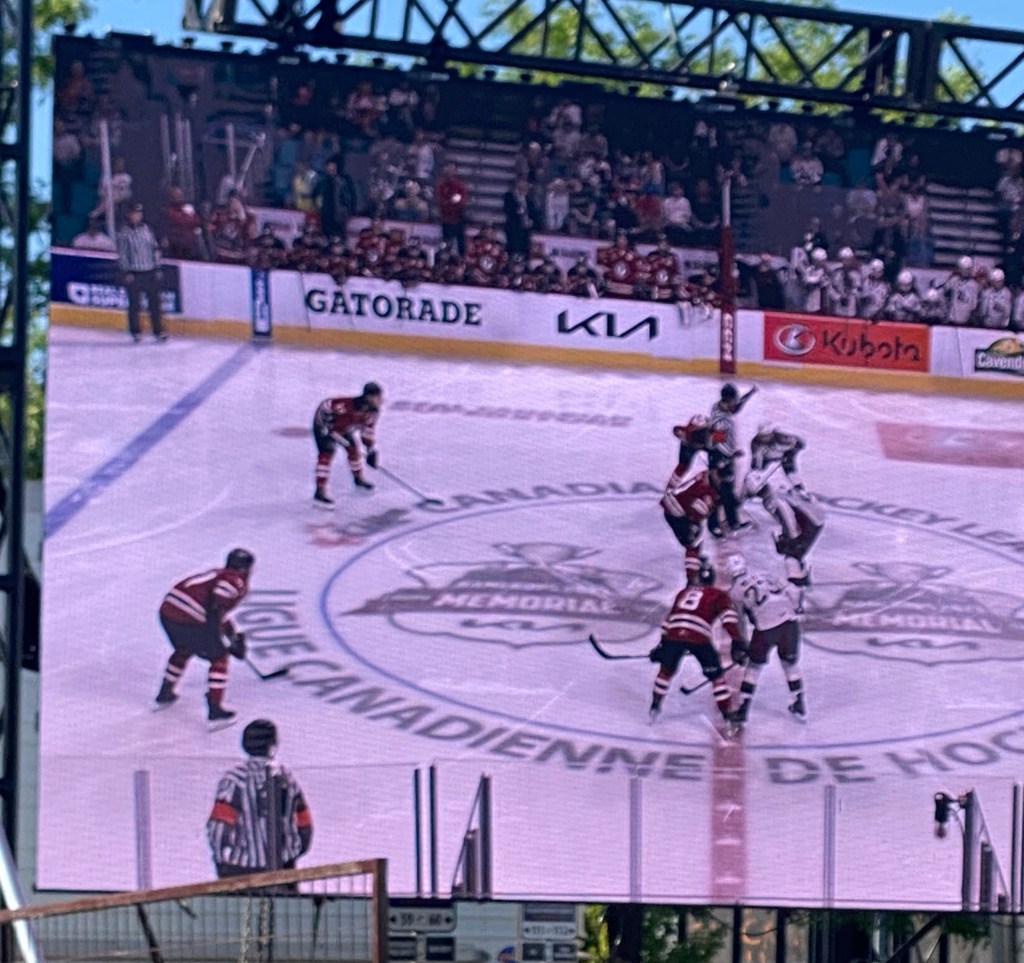 It had been our biggest day on the bus and the Yellowhead Highway had taken us all the way to Kamloops. One of our favourite places to walk in any city is to walk along the river. This was no different in Kamloops. It was a lovely walk in the park along side the Thompson River. The warmer weather had brought out families having picnics and children playing in the splash zones. As we meandered back, we came across the crowd entering the Kamloops hockey stadium. Before we knew it, we were in the free zone having a beer in time for the puck drop for the Kamloops 2023 Memorial Cup ice hockey playoffs. The big screens outside the stadium were broadcasting the game between the Peteborough Pete’s and the Quebec Remparts. An ice hockey game was something we had wanted to do while in Canada and I thought our chance had disappeared. Then bingo!