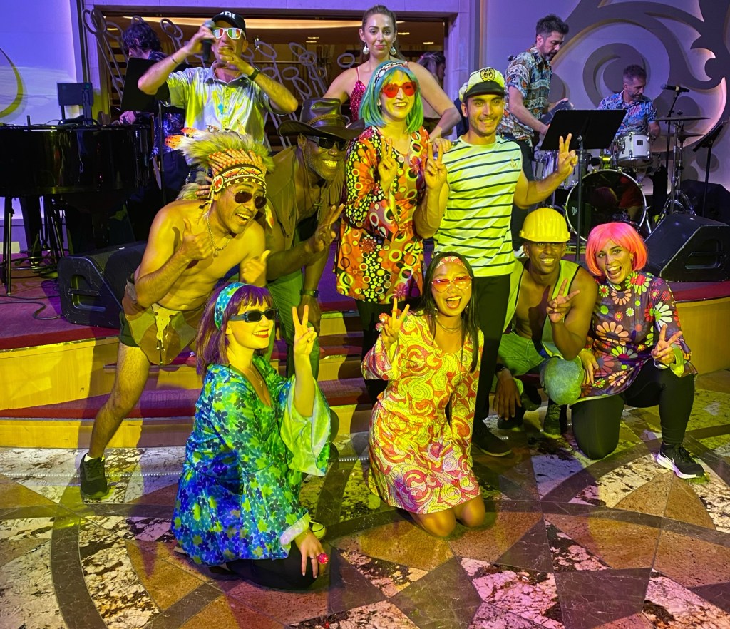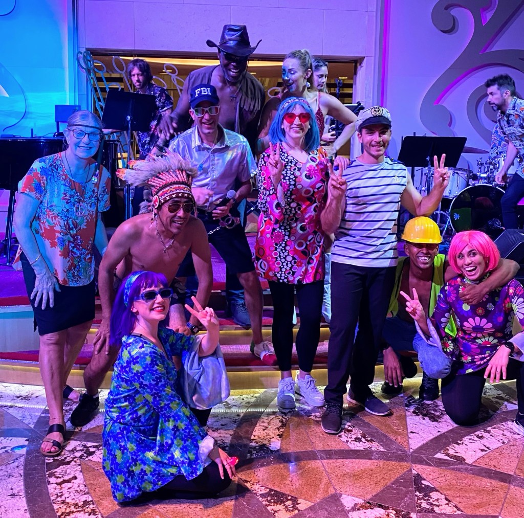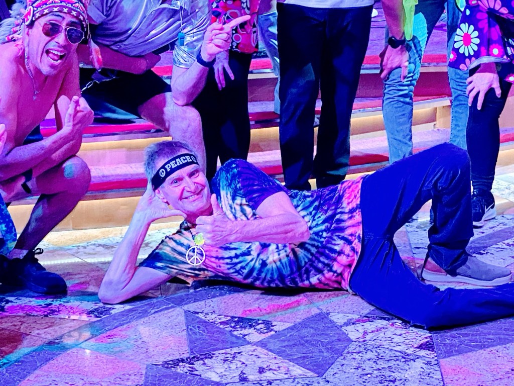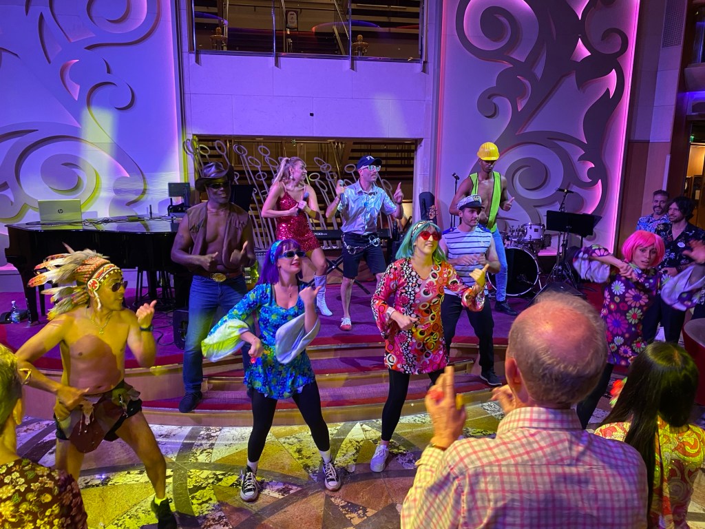 I have been to so many 70’s theme cruise parties that the John Travolta dance moves come naturally to me. So I thought….. but alas, it’s harder than you think when you’ve got 2 left feet! Just the same a great party night was had and Ruthie collected some more disco flashing rings.