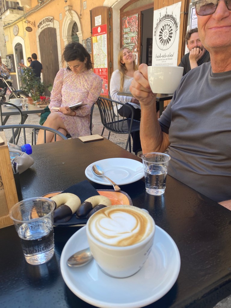 The food and coffee aromas overcame us and we stopped at a coffee bar. We were told the wine is delicious and a higher % alcohol content but we were craving coffee. It was a great people watching area. The temperature was a balmy 30 degrees and I could have stayed in the shade until aperitivo time but unfortunately the ship would have sailed without me.