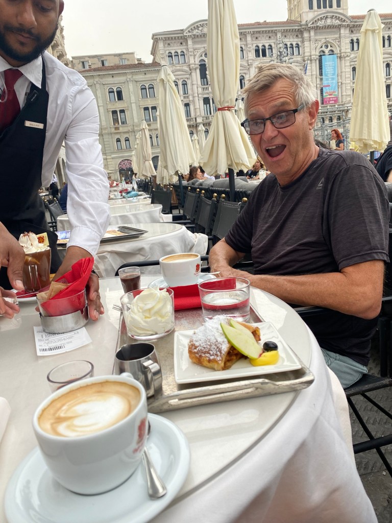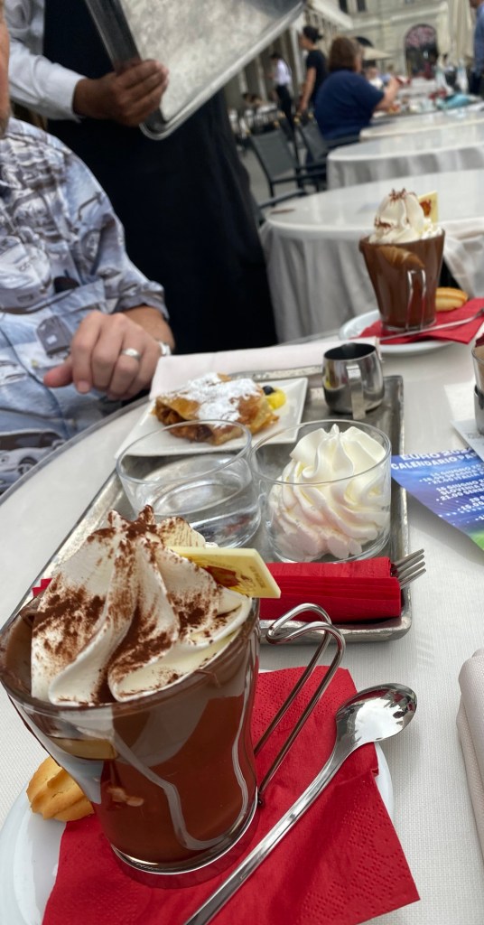 There were a multitude of eateries and cafes to choose from and what seems to have become our Italian tradition is to start with coffee. Being in the north-eastern part of Italy it is known for its unique blend of Italian, Austrian, and Slovenian influences due to its historical ties with the Austro-Hungarian Empire and its proximity to Slovenia. That’s why it made sense to have Apple strudel and cream with our coffee. Well that’s my excuse anyway.