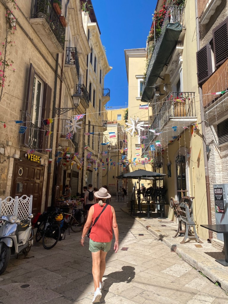 Nothing too strenuous in Bari. Just a mere 9 k’s. Off the ship, along the wharf and we had walked to the old town. Maybe there’s some Italian in Ruthie as she immediately started hand gesturing towards me. I think she likes it. The small little lanes with their produce, souvenir and coffee bars really appealed. If you looked up, the washing was flying in the breeze from balconies. We had to duck the locals who didn’t seem to slow down on their bicycles or mopeds in the narrow lanes.